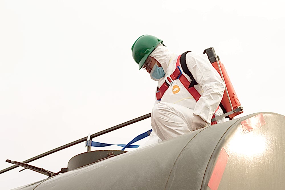 3-) Ön durulama yapıldıktan sonra deenfeksiyon ve ince temizlik yapılır. Yüzey dezenfektsiyonu için ”İçme Suyu Depolarında Kullanılabilirlik Sertifikalı Kimyasal Spreyler” kullanılır.)
